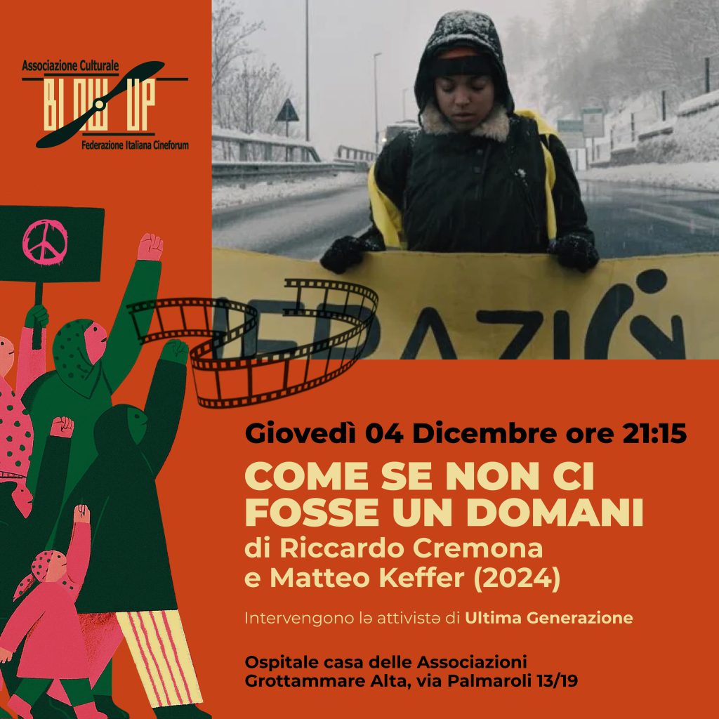 giovedì 4 dicembre, alle 21.15 ci sarà la proiezione del film COME SE NON CI FOSSE DOMANI di Riccardo Cremona e Matteo Keffer (ITA, 2024) che ricostruisce, con la consulenza di Paolo Giordano, la resistenza civile nonviolenta di Ultima Generazione come risposta alle gravi minacce ecologiche che minano il nostro futuro. Attraverso azioni controverse e spettacolari – come blocchi stradali e imbrattamenti di opere d’arte – Ultima Generazione ha attirato l’attenzione dei media e della politica, sfidando l’indifferenza dei governi e chiedendo interventi urgenti per il clima.