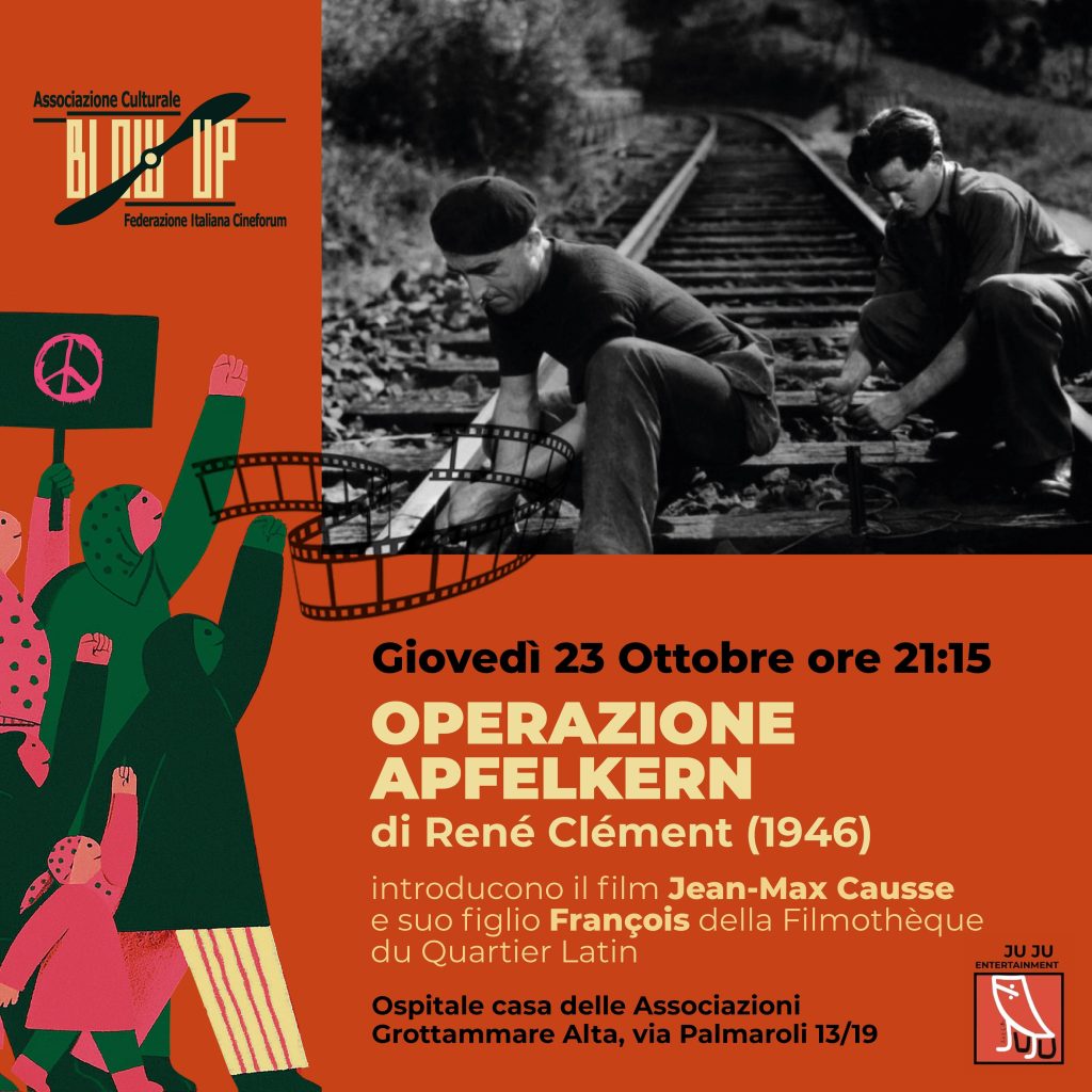 giovedì 23 ottobre, alle 21.15 verrà proiettato OPERAZIONE APFELKERN (Fra, 1946) di René Clement in versione restaurata, un film straordinario che già l’anno dopo la fine della guerra racconta la resistenza francese al nazifascismo. Opera insolita per il cinema francese che anticipa la nouvelle vague ed è vicina al neorealismo italiano e in particolare a Roberto Rossellini e al suo Paisà.