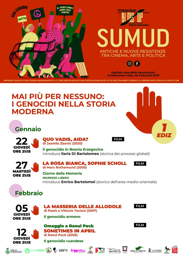 Parte giovedì 22 gennaio, una minirassegna tematica all’interno della stagione dell’associazione Blow-up di Grottammare, dedicata ai genocidi nelle loro drammatiche e svariate manifestazioni. La rassegna si intitola Mai più per nessuno e riprende lo spirito della legge che ha istituito il giorno della memoria che si celebra il 27 gennaio e cioè quello di fare in modo che i genocidi non si ripetano più nel corso della storia umana. Una rassegna dolorosa ma necessaria soprattutto in questa fase storico politica in cui un genocidio è in corso, quello perpetrato dallo stato di Israele nei confronti della popolazione palestinese. Attraverso quattro pellicole avremo la possibilità di riflettere su un fenomeno storico terribile e di comprenderne le dinamiche e le motivazioni, le similitudini e le differenze. La rassegna, alla sua prima edizione, si occuperà del genocidio in Bosnia col film Quo Vadis Aida di Jasmila Zbanic , del genocidio a danno degli ebrei in Europa col film La rosa bianca di Marc Rothemund, del genocidio degli armeni col film La masseria delle allodole di Paolo e Vittorio Taviani e del genocidio in Ruanda col film Sometimes in april di Raoul Peck .
