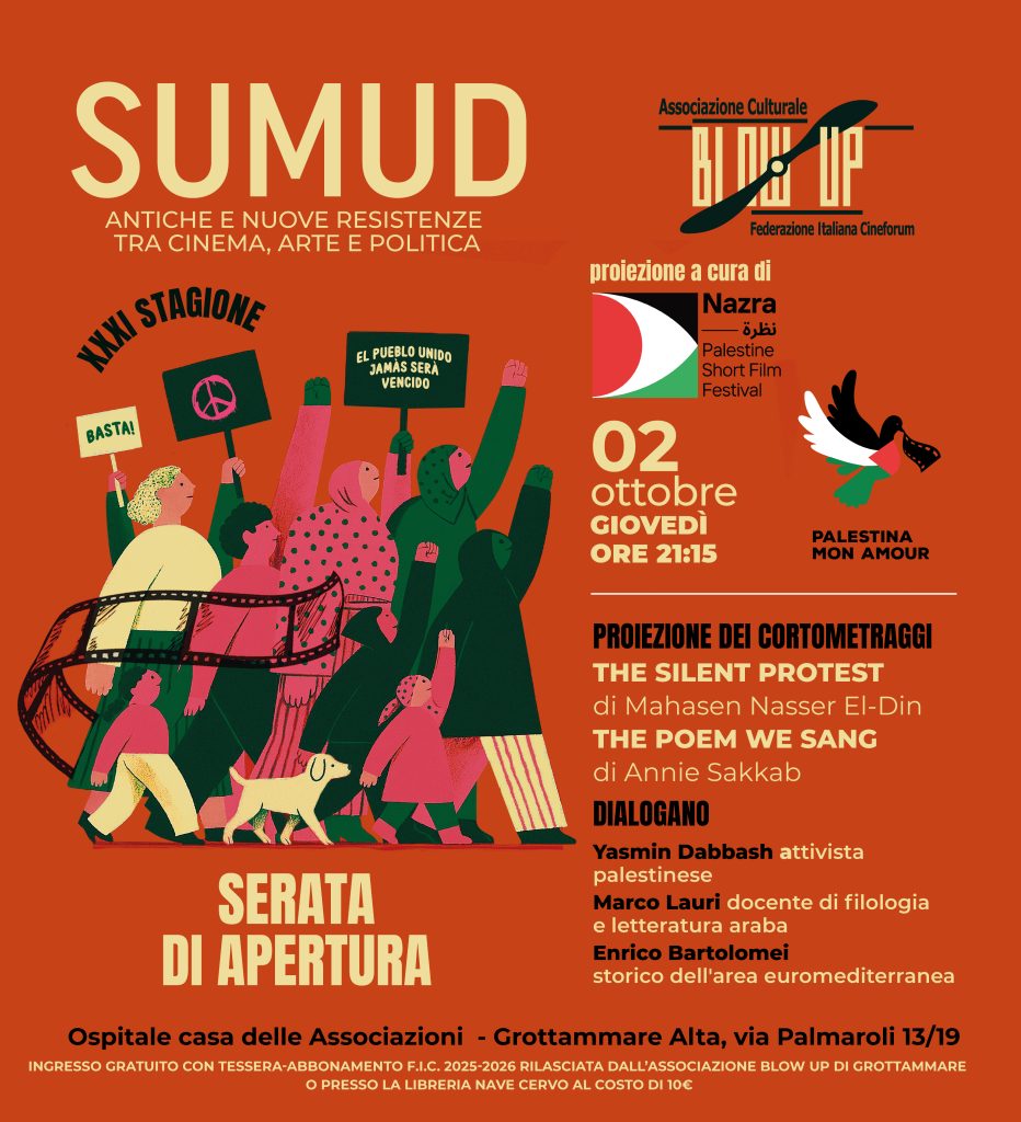Finalmente ripartiamo il 2 ottobre con una rassegna coraggiosa e determinata SUMUD – Antiche e Nuove Resistenze tra cinema, arte e politica per fare emergere e valorizzare tante forme di resistenza umana nel mondo e nella storia.
